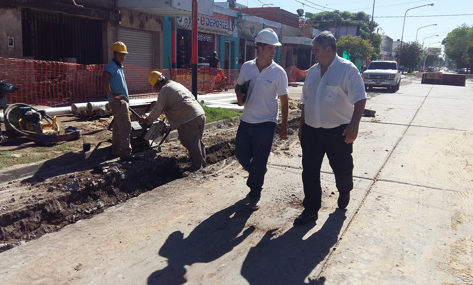 · Cañería de refuerzo de agua para zona este, que consiste en la instalación de aproximadamente 1500 metros de cañería, realizando un empalme a la cañería desde J. Jaures y Rivadavia culminando en Calle 3 de Febrero y Avda. Perón, incluyendo el cruce bajo las vías del Ferrocarril.