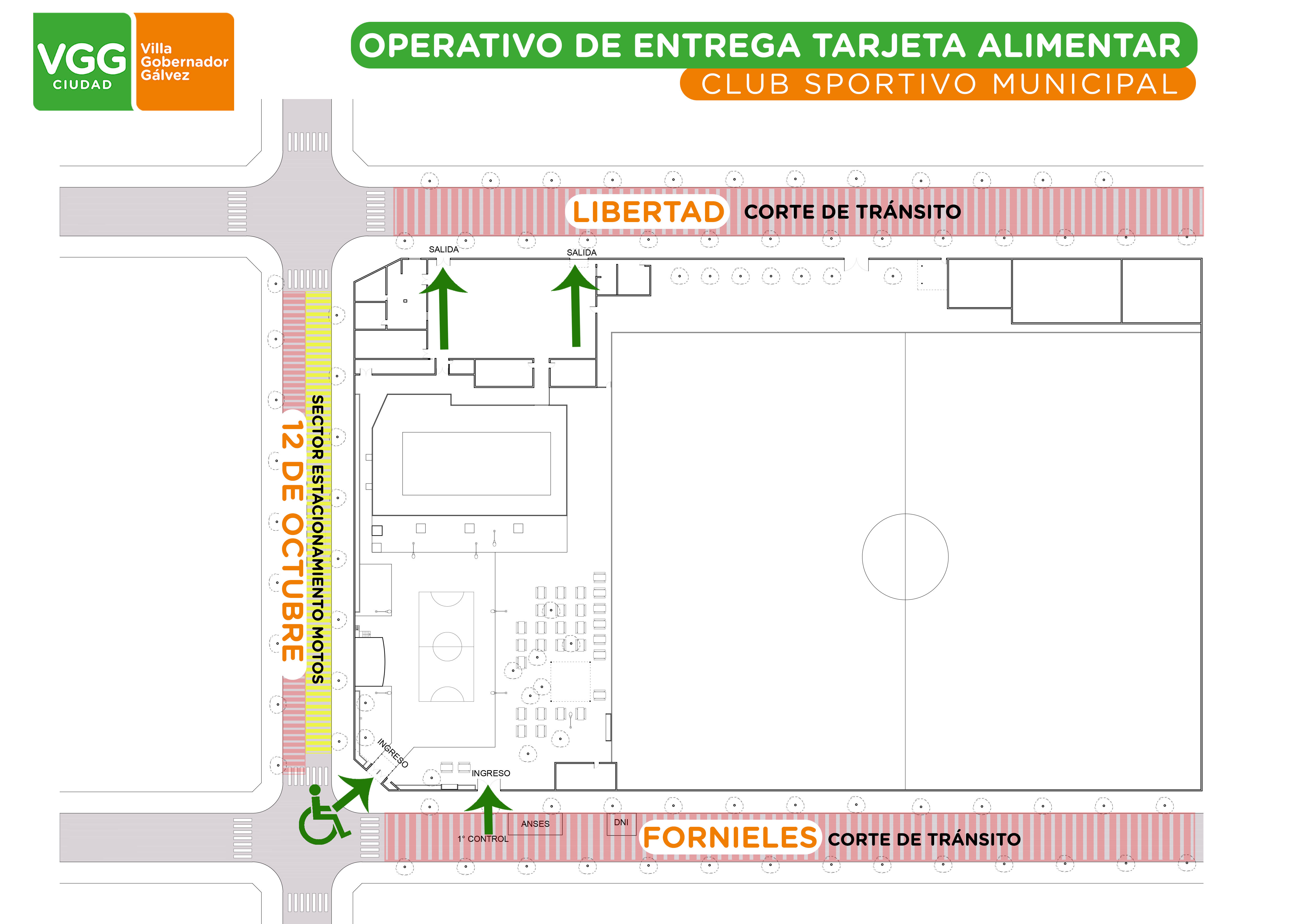 La entrega se realizará en club Sportivo Municipal. El ingreso será por calle Fornieles, mientras que el egreso será por calle Libertad. Antes de la puerta principal habrá un puesto de control en donde se verificará el turno asignado.